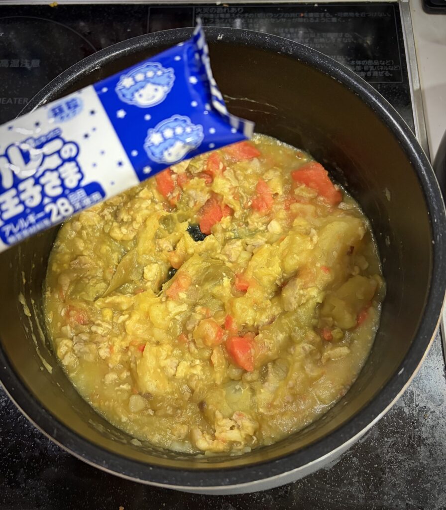 自然減圧後、カレーはルウを入れて再加熱、